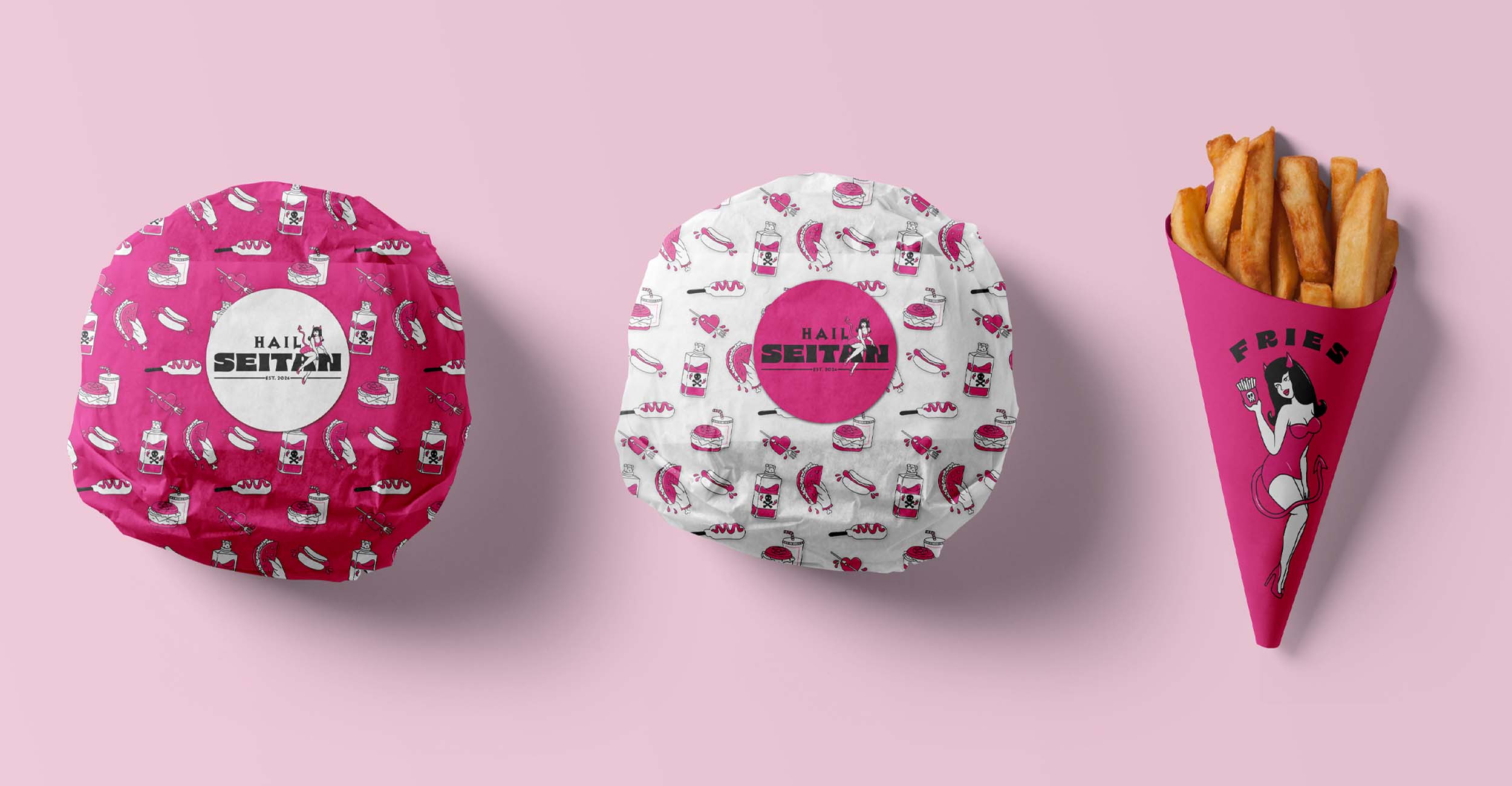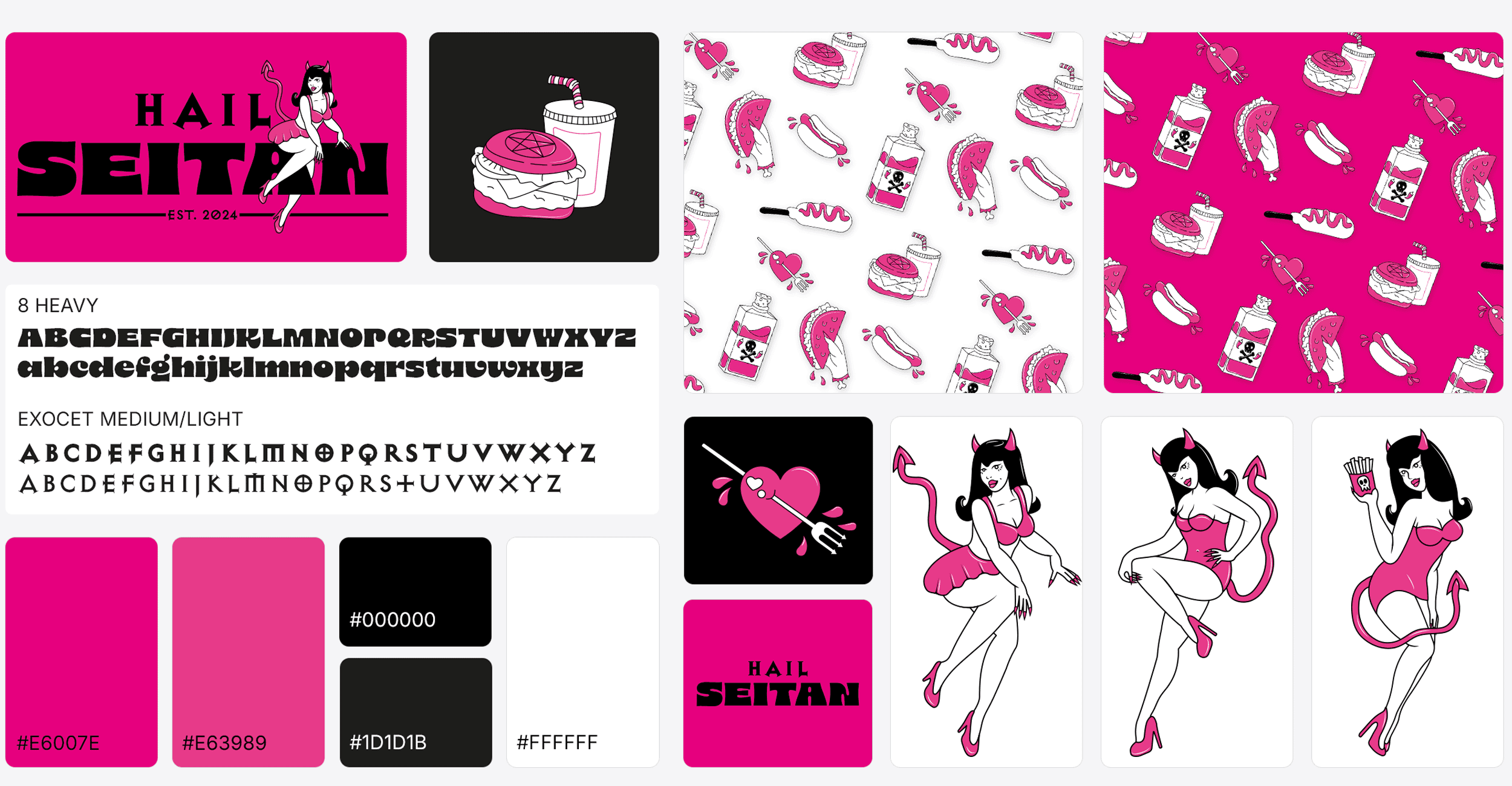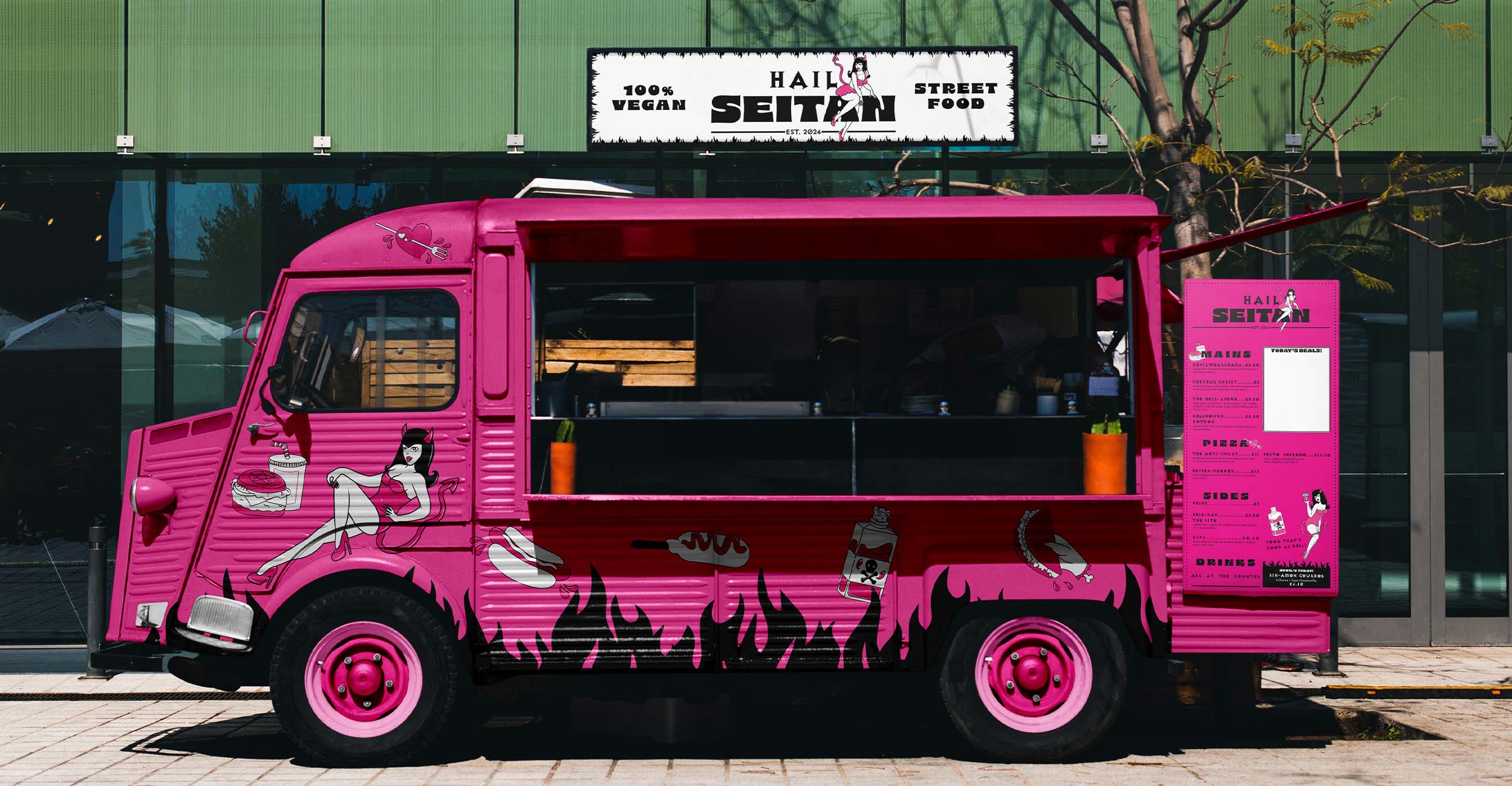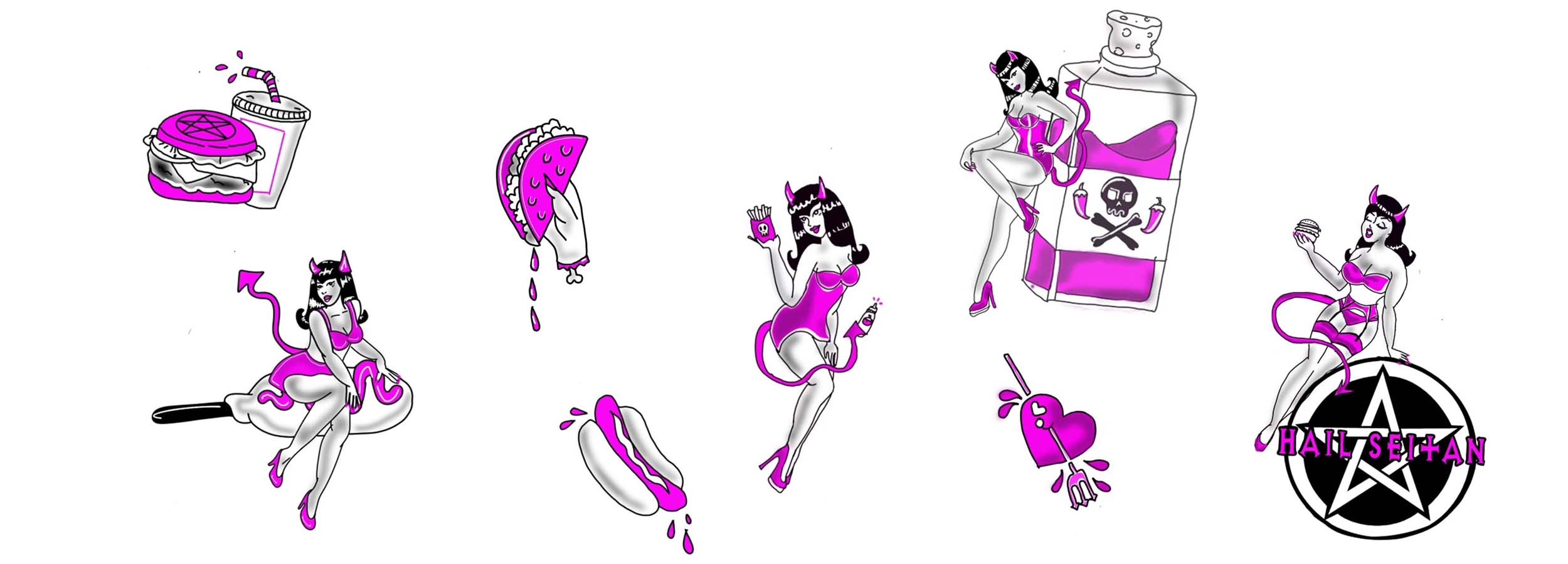 Central to the brand identity is a collection of devilish mascots influenced by traditional tattoo art and classic pin-up illustrations. These characters lean into the "hellish" brand theme, offering a playful yet provocative energy. This rebellious visual language ensures the truck serves as a memorable and "insta-worthy" destination in any urban environment.